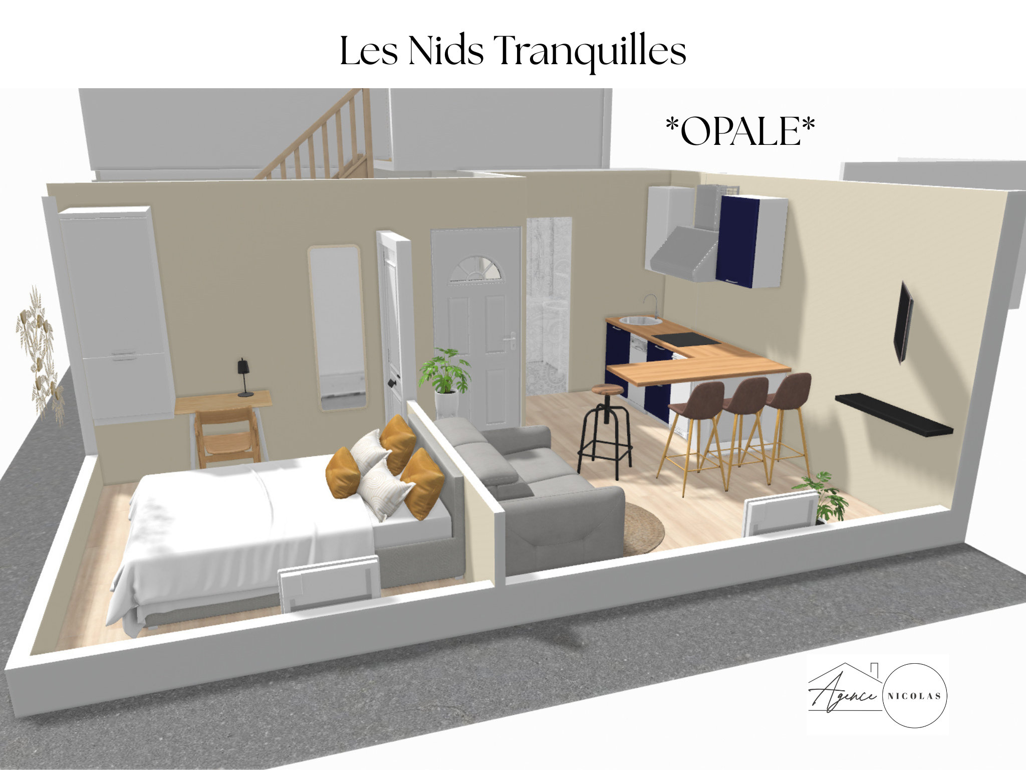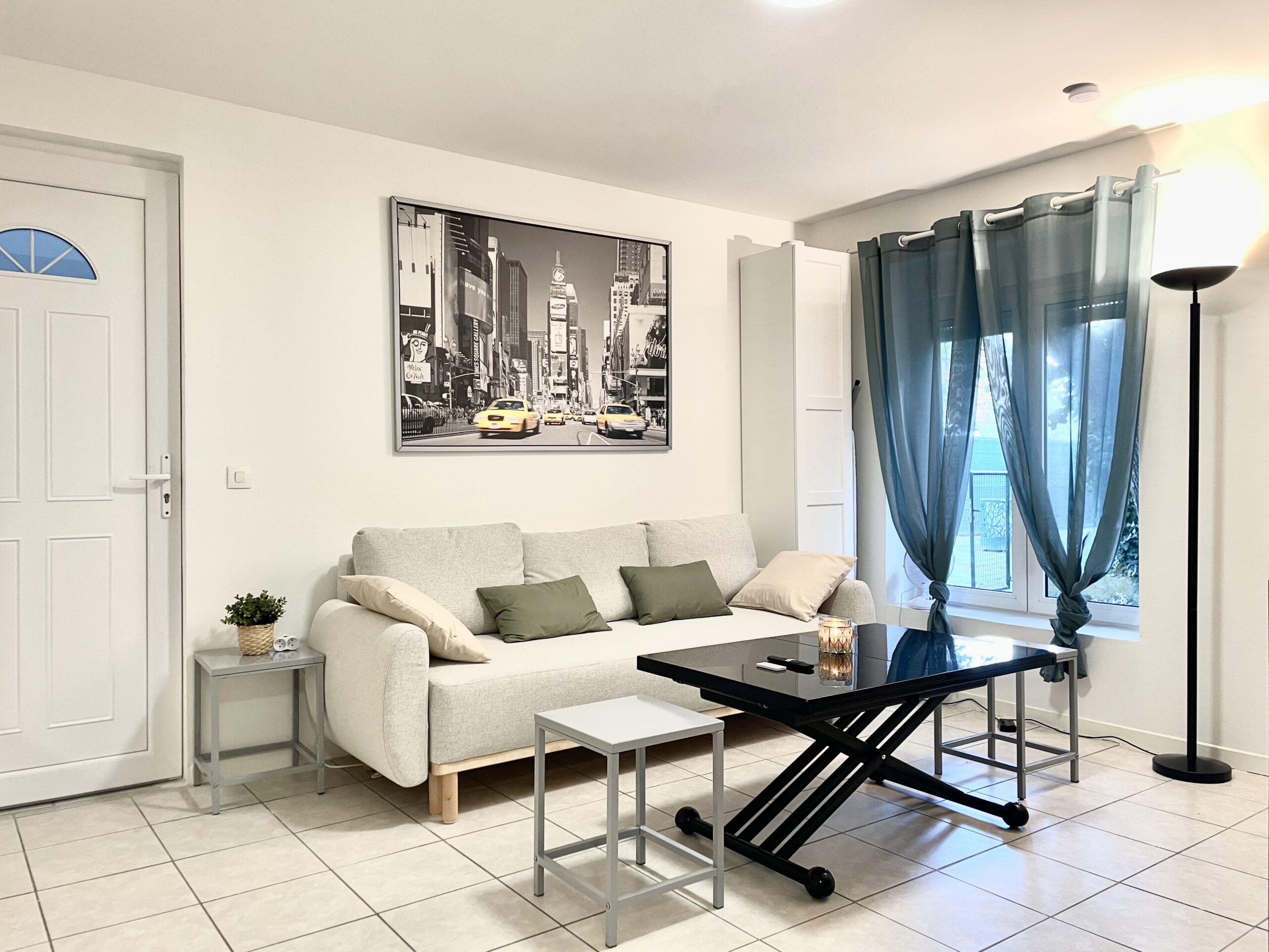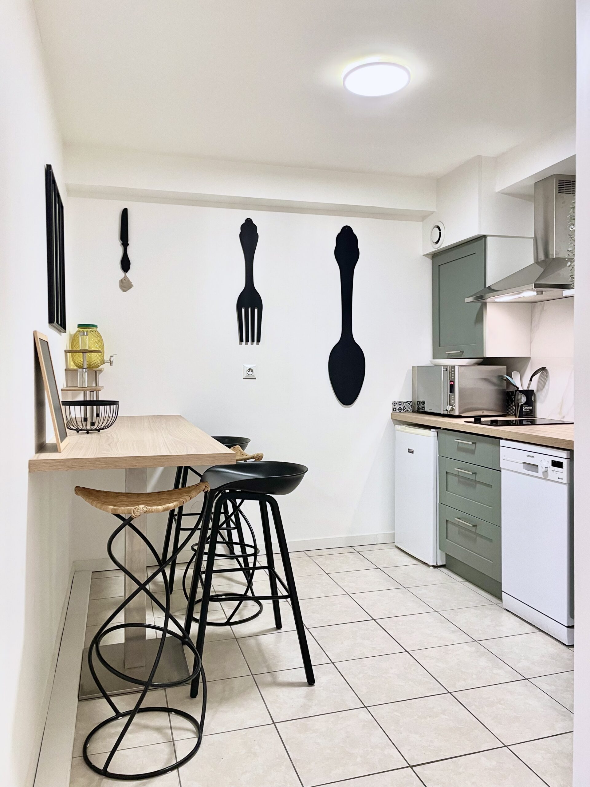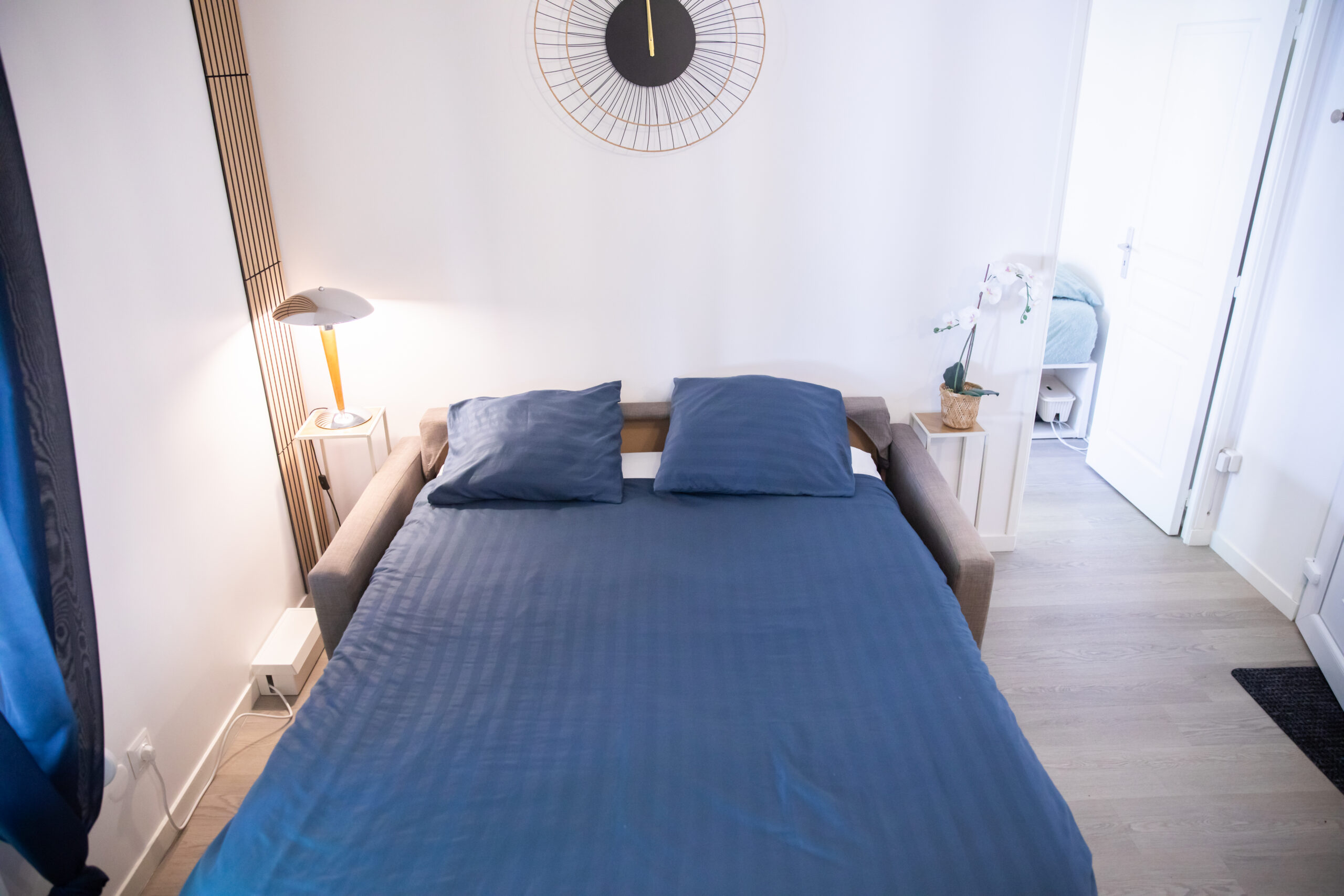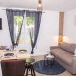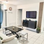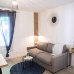 Cet appartement de deux pièces propose un agencement fonctionnel et optimisé. La pièce de vie principale intègre un coin salon avec un canapé convertible, un espace repas et une cuisine ouverte. L’ensemble est décoré de manière sobre, privilégiant la clarté et l’aspect pratique pour les courts ou longs séjours.