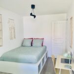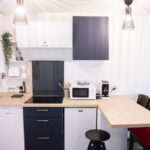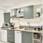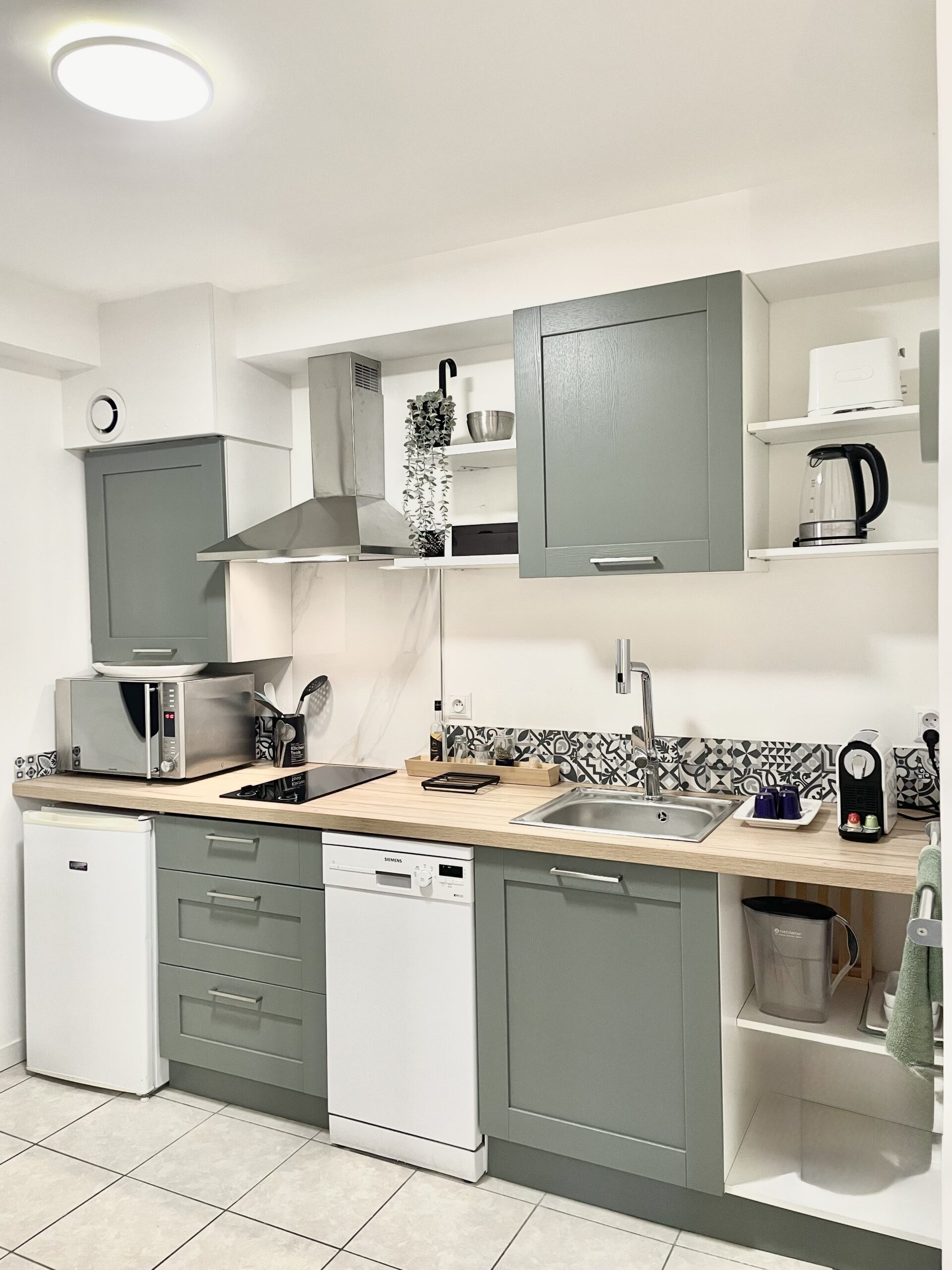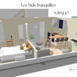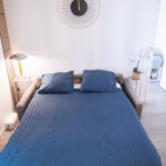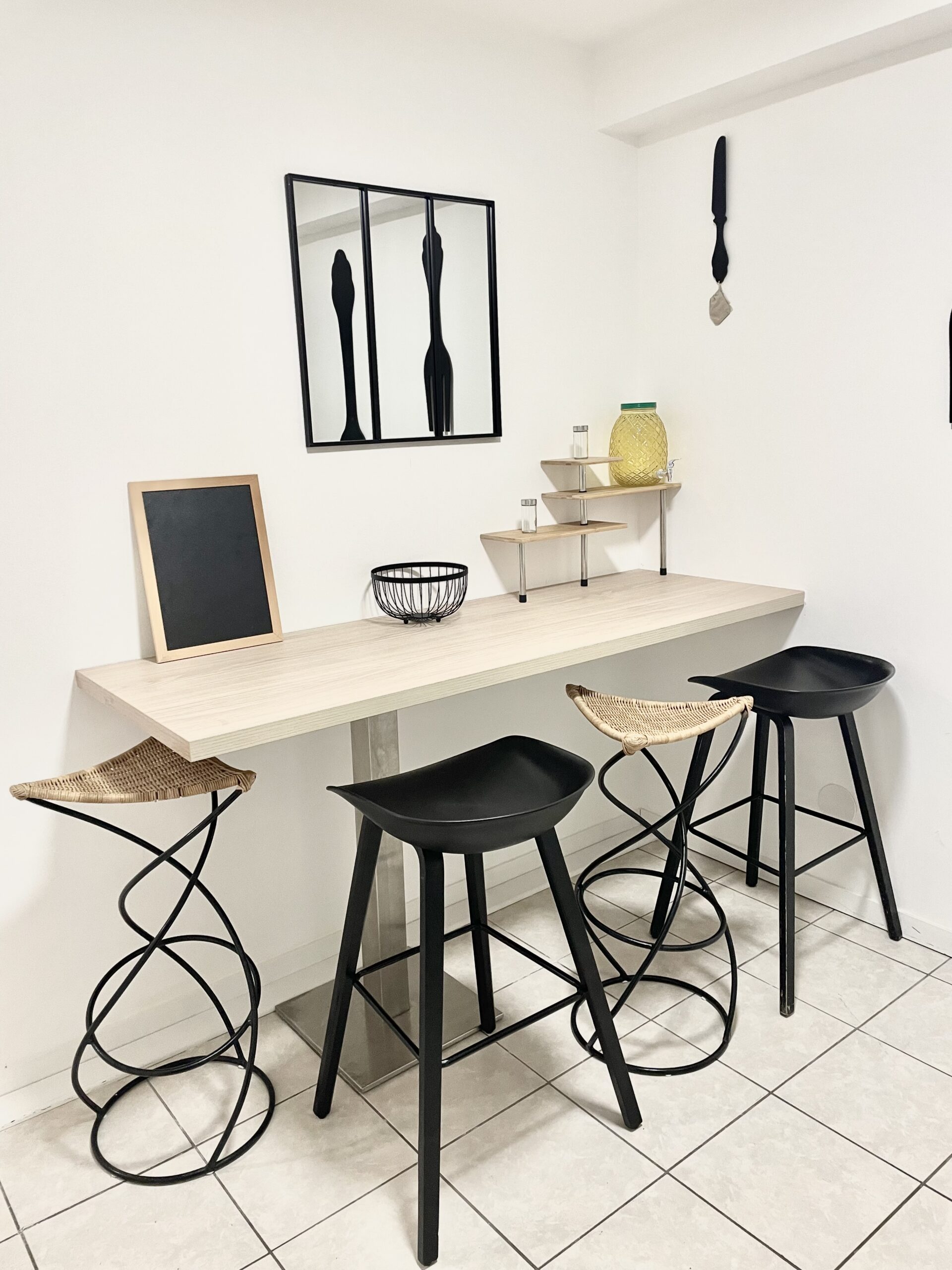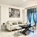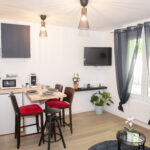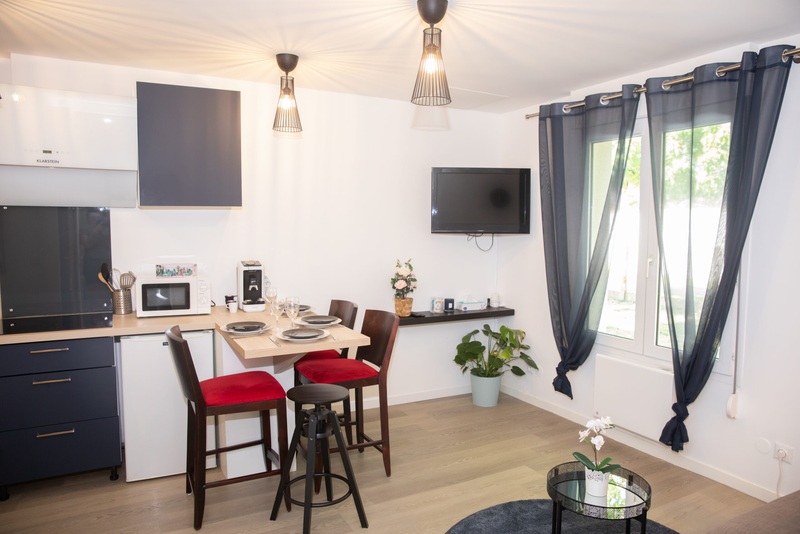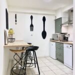 Cet appartement de deux pièces propose un agencement fonctionnel et optimisé. La pièce de vie principale intègre un coin salon avec un canapé convertible, un espace repas et une cuisine ouverte. L’ensemble est décoré de manière sobre, privilégiant la clarté et l’aspect pratique pour les courts ou longs séjours.