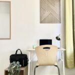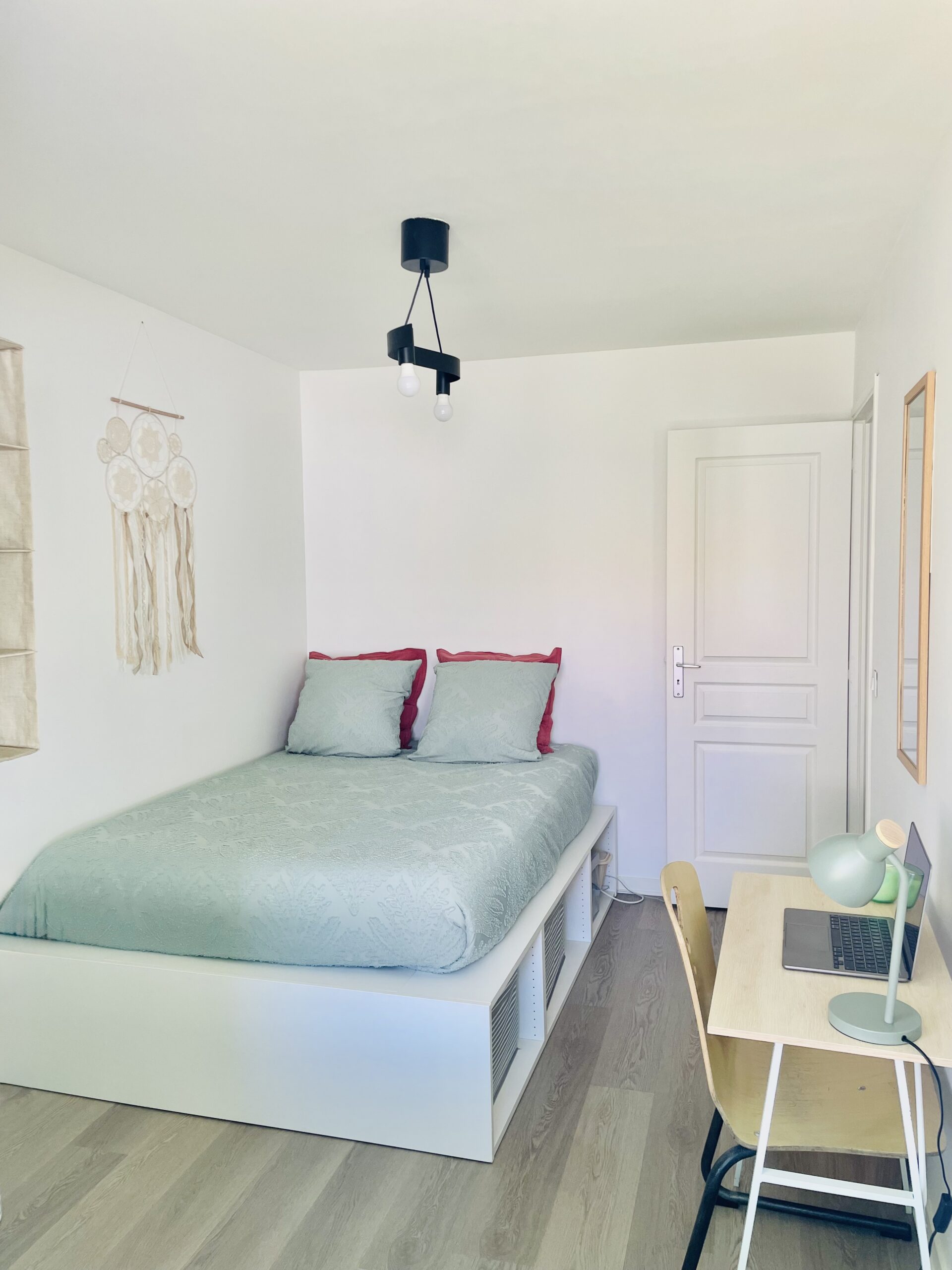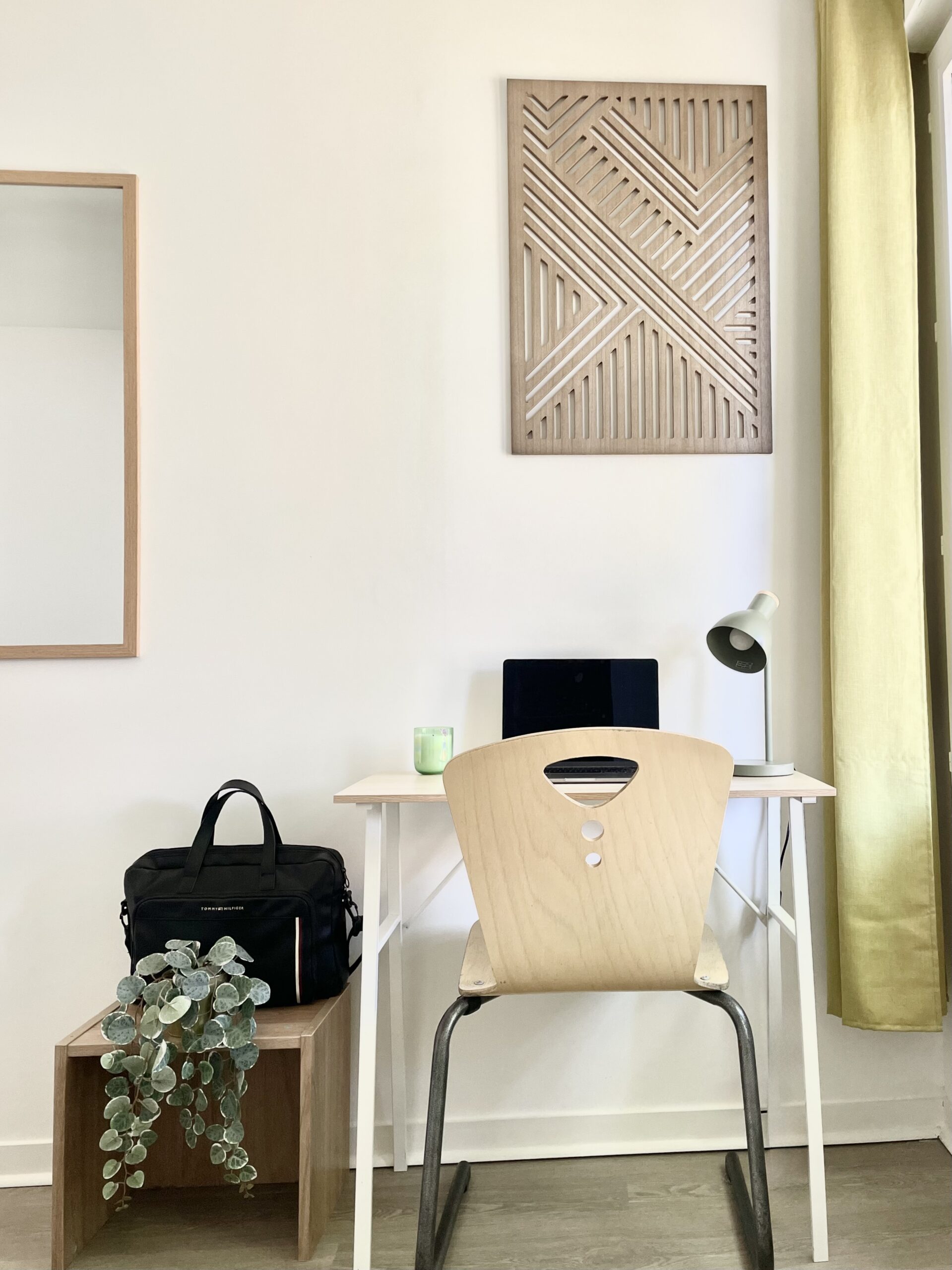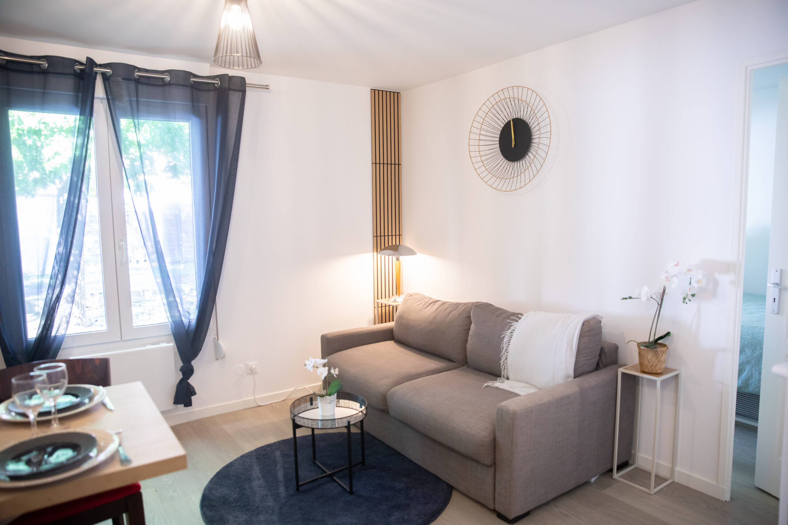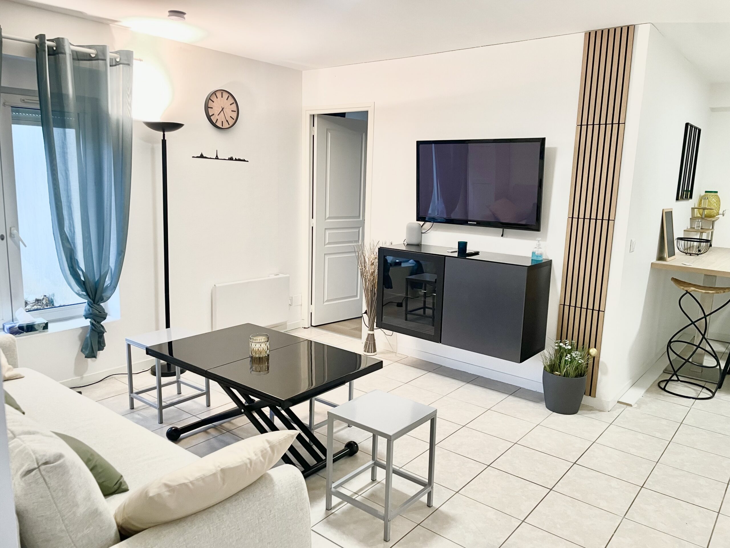 Cet appartement de deux pièces offre un espace de vie fonctionnel et lumineux. Le séjour est équipé d’un canapé, d’une télévision murale et d’une table modulable permettant de déjeuner confortablement. La décoration est simple et moderne, associant des tons neutres à un mobilier contemporain.